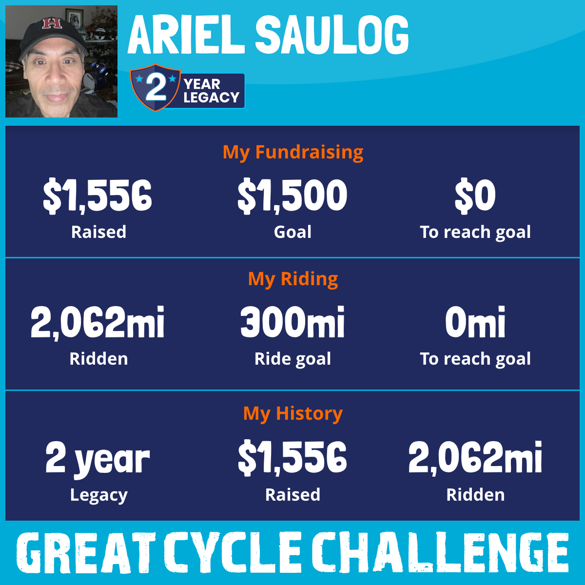 2,062 mi Ridden$1,556 Raised2025