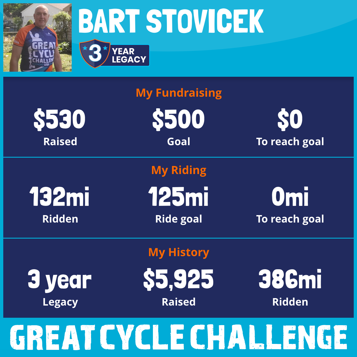 I am participating in the Great Cycle Challenge to honor my relatives, past and present, who have, and still do, battle cancer. This challenge is important to me not just because it raises crucial awareness and funds for cancer research, which is essential in the fight against a disease that has impacted my family for generations, but also because it affects us all. Every mile I ride is a step towards finding a cure, reducing suffering, and defeating this insidious disease. I support this cause because it is a worthwhile effort. Cancer affects, and has affected, my family, for generations. Our best defense to this disease is to work together toward its demise. I ask you to consider supporting my effort to raise funds for cancer research, in whatever way you can.