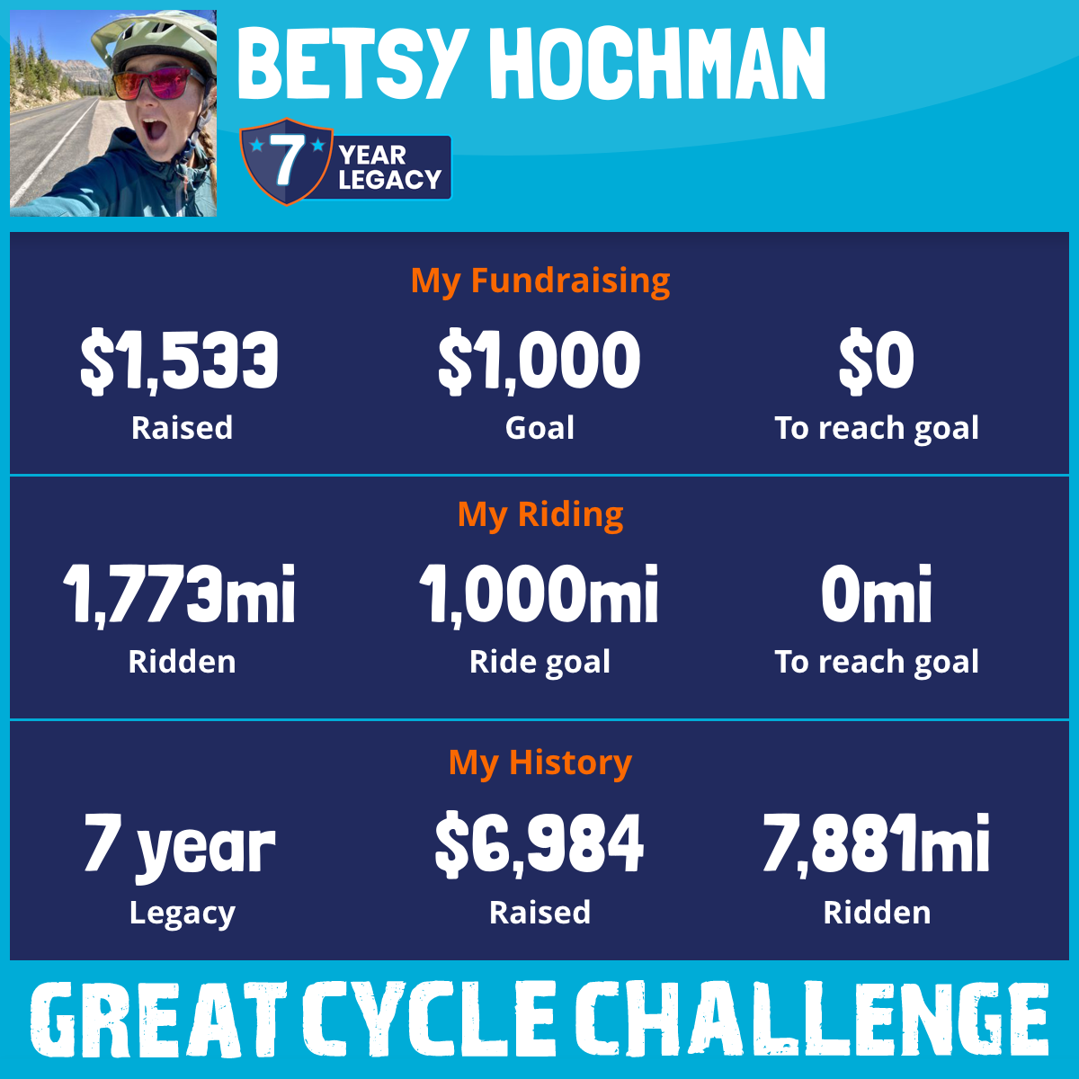 I ride in the Great Cycle Challenge every September to support individuals and families dealing with cancer and to honor my mom, who I lost to ovarian cancer in 2012 after an 8 year battle. This year - my 7th Great Cycle Challenge - my goals are to mountain bike/gravel bike 1,000 miles and raise $1,000 for the Children’s Cancer Research Fund.