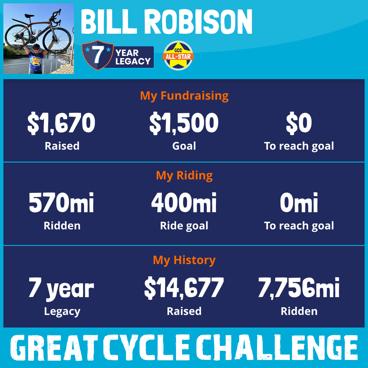 My seventh (whew) year riding for this important cause and organization, I will again be peddling throughout the month of September in support of the Great Cycle Challenge to fight kids' cancer. My goal is to pedal 400 miles throughout the month, but I will be trying to beat that. My more important goal is to raise more than $1500 doing it. I am starting my fundraiser later than in past years (September starts tomorrow!), so I have missed out on some fundraising time and set by goal a bit more cautiously, but I feel confident in the support of friends and family to put me over my goal, and who knows - maybe I will still beat last year.