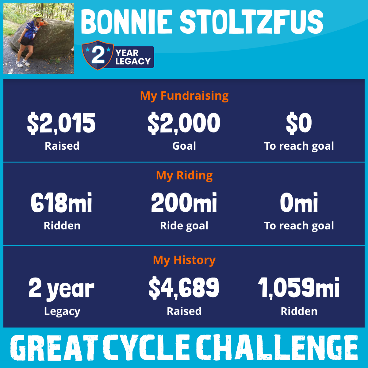 As a 3 year cancer survivor, I understand the emotions following a cancer diagnosis. Cycling has become a beneficial stress reliever and adventure as I pedal the back roads of Big Valley or Rail Trails. Therefore, this cycling challenge has resonated within me. So for the second year, this September, I am taking part in the Great Cycle Challenge to fight kids' cancer!