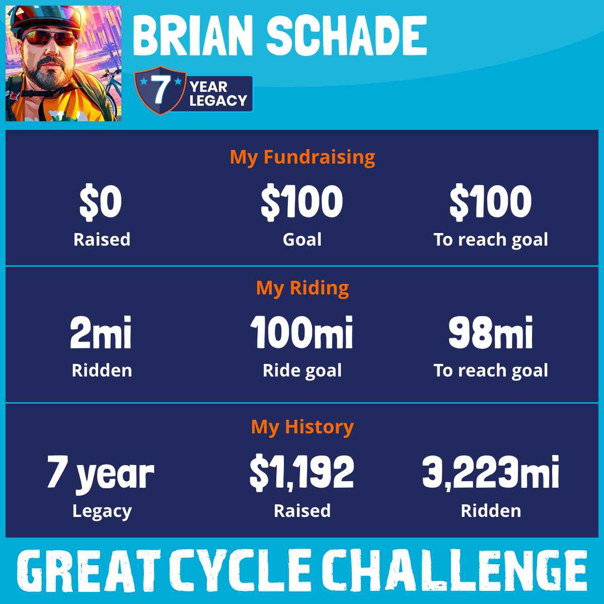 I believe that all children should be able to live a life free from cancer. In 2016, I rode to support my wife's cousin's daughter, Moriah Anderson. She is a survivor of Burkitt's Leukemia. I am so pleased to report that she has beaten the enemy and kicked cancer's butt. She's a vibrant young woman who is full of life. This year I do not have anyone in particular that I ride for. So I ride for all children suffering from this terrible disease. Please help me to help them. My goal is to raise $500.00 this month. I will be riding towards a goal of 300 miles to help make this happen. Please consider making a donation to the cause by clicking the Donate button. Any amount will be considered gracious and generous and will be appreciated greatly. Thanks. Stay upright and keep the rubber side down! -Brian
