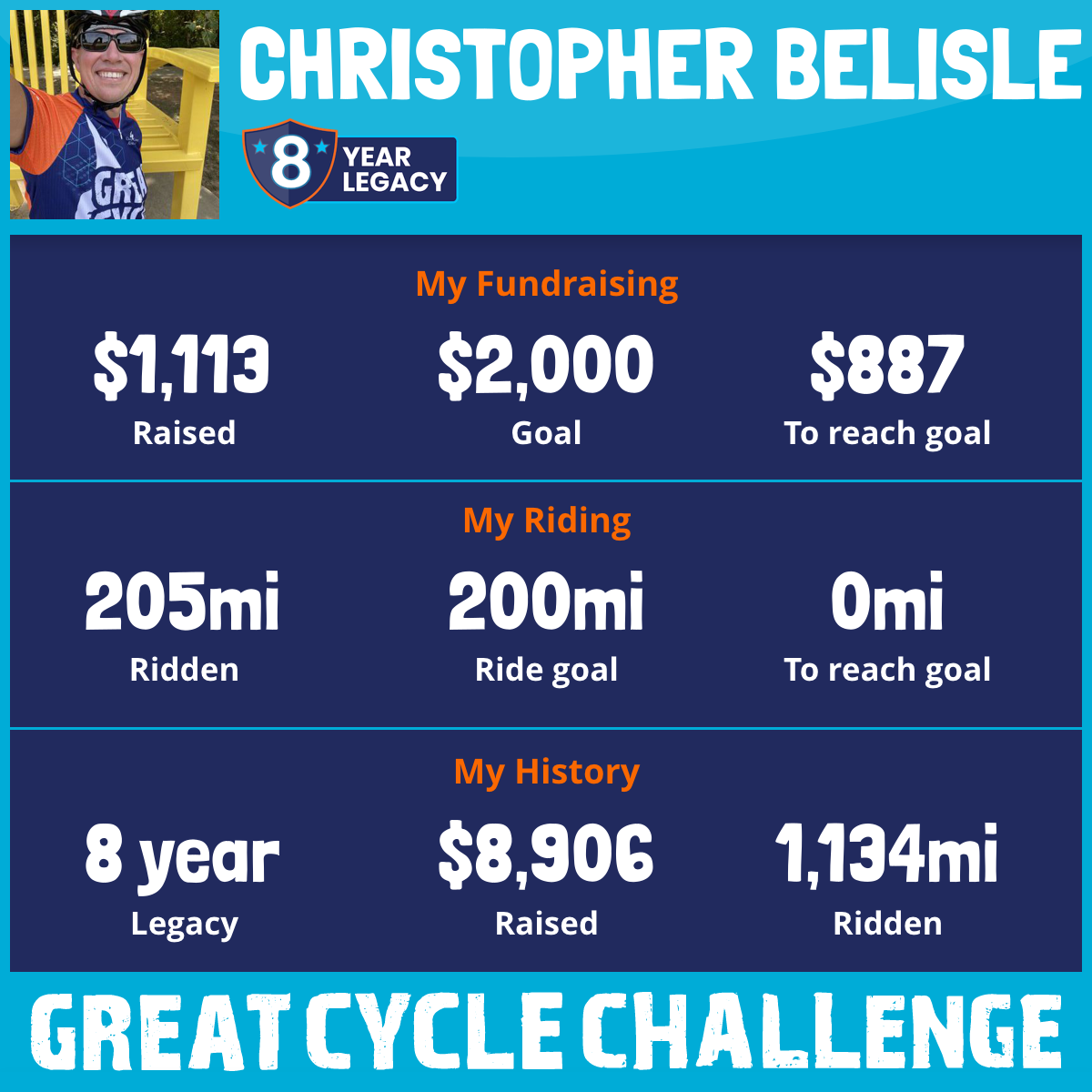 So I am raising funds through my challenge to help these kids and support Children's Cancer Research Fund to allow them to continue their work to develop lifesaving treatments and find a cure for childhood cancer. My goal is $2500 in funds & riding 250 miles.