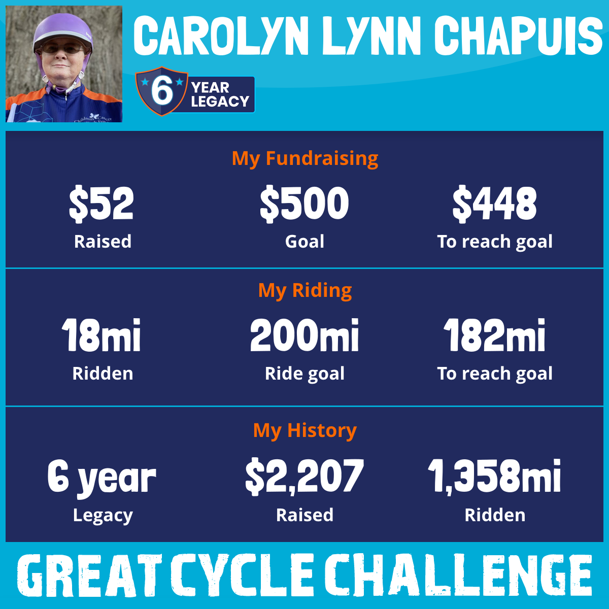 I am riding 200 mi for Carolyn Chapuis. Please sponsor me and support my challenge to fight kids' cancer and save little lives.