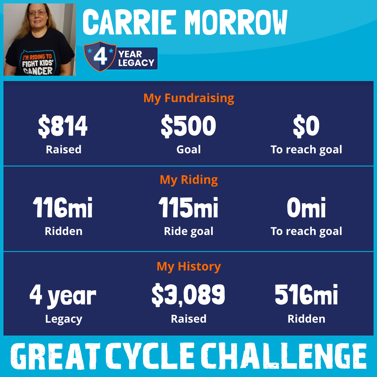 I ride in memory of the love of my life, Kris Nutting, who passed away this year and was an avid cyclist, who got me involved in the sport. I also ride for my sons, Hunter Morrow and Nathaniel Austin, as they are my motivation for just about everything and I have been blessed to have healthy children. All children should have that opportunity. So please sponsor me and let's help these little warriors fight cancer, be cured and live the wonderful life they deserve!