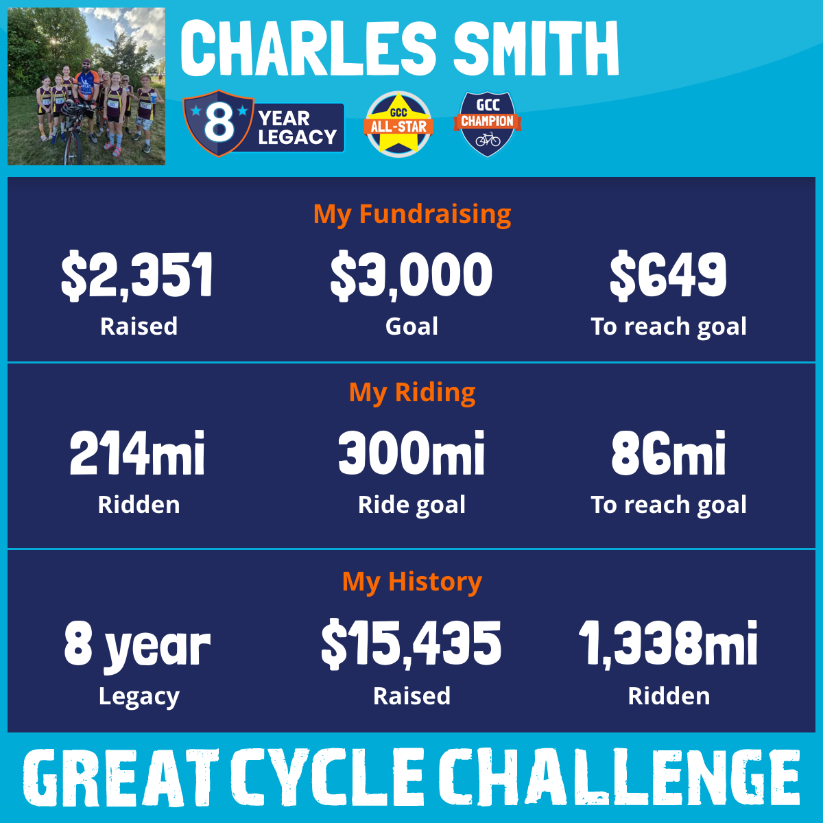 The last 4 years I have failed to hit my 300 mileage and $3000 goal. So that has been adding to my motivation to make up for it this year. I am getting motivated and determined to hit and surpass my goal. So, lets do it and get started to fight childhood cancer!