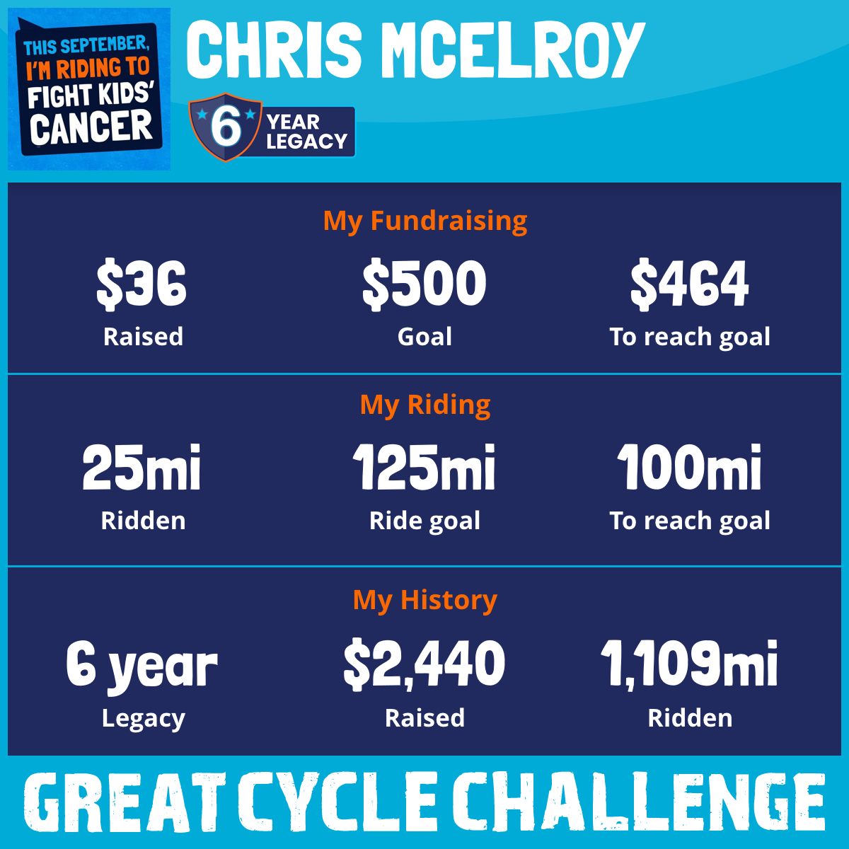 I am riding 125 mi for All. Please sponsor me and support my challenge to fight kids' cancer and save little lives.