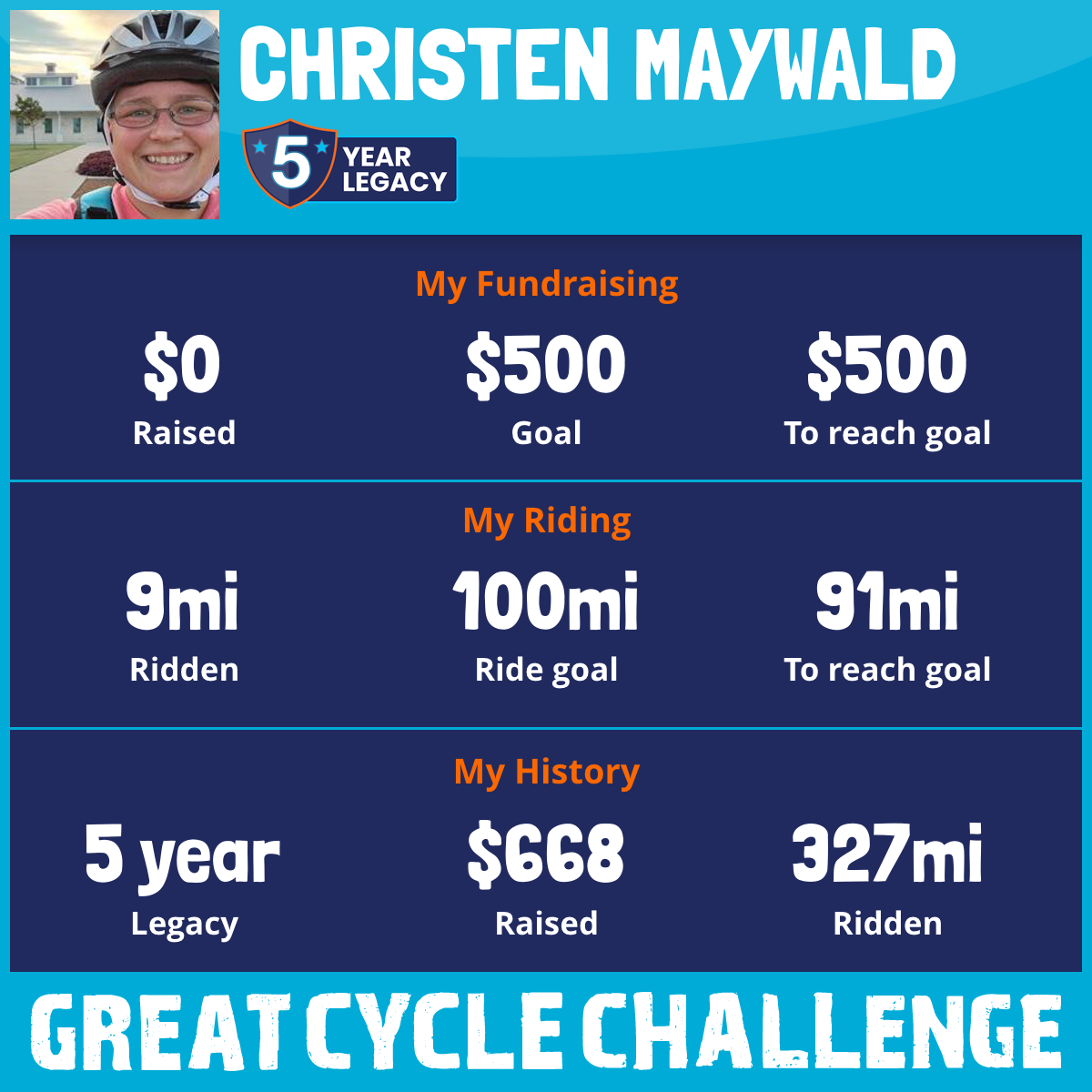 I am riding 100 mi for The kids. Please sponsor me and support my challenge to fight kids' cancer and save little lives.
