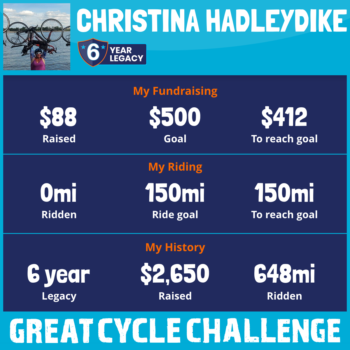 I am riding 150 mi for Karen HadleyDike. Please sponsor me and support my challenge to fight kids' cancer and save little lives.