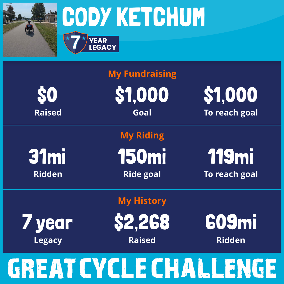 8 Sep 2025Unfortunately my Great Cycle Challenge has come to an abrupt end this year. A rough transition coming off a bridge caused my bike frame to crack in half. Please consider donating to my wife's page: https://greatcyclechallenge.com/riders/jessketchum