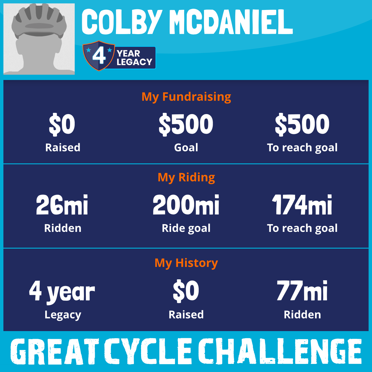 I am riding 200 mi for Jace DeLoach. Please sponsor me and support my challenge to fight kids' cancer and save little lives.