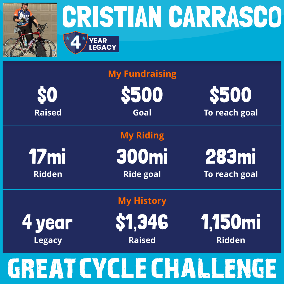 Hi! I am Cristian, teacher for almost 30 years. This September, I am taking part in the Great Cycle Challenge to fight kids' cancer! I am riding for every child who I have not met and my students, now parents, who have kids and are fighting cancer.