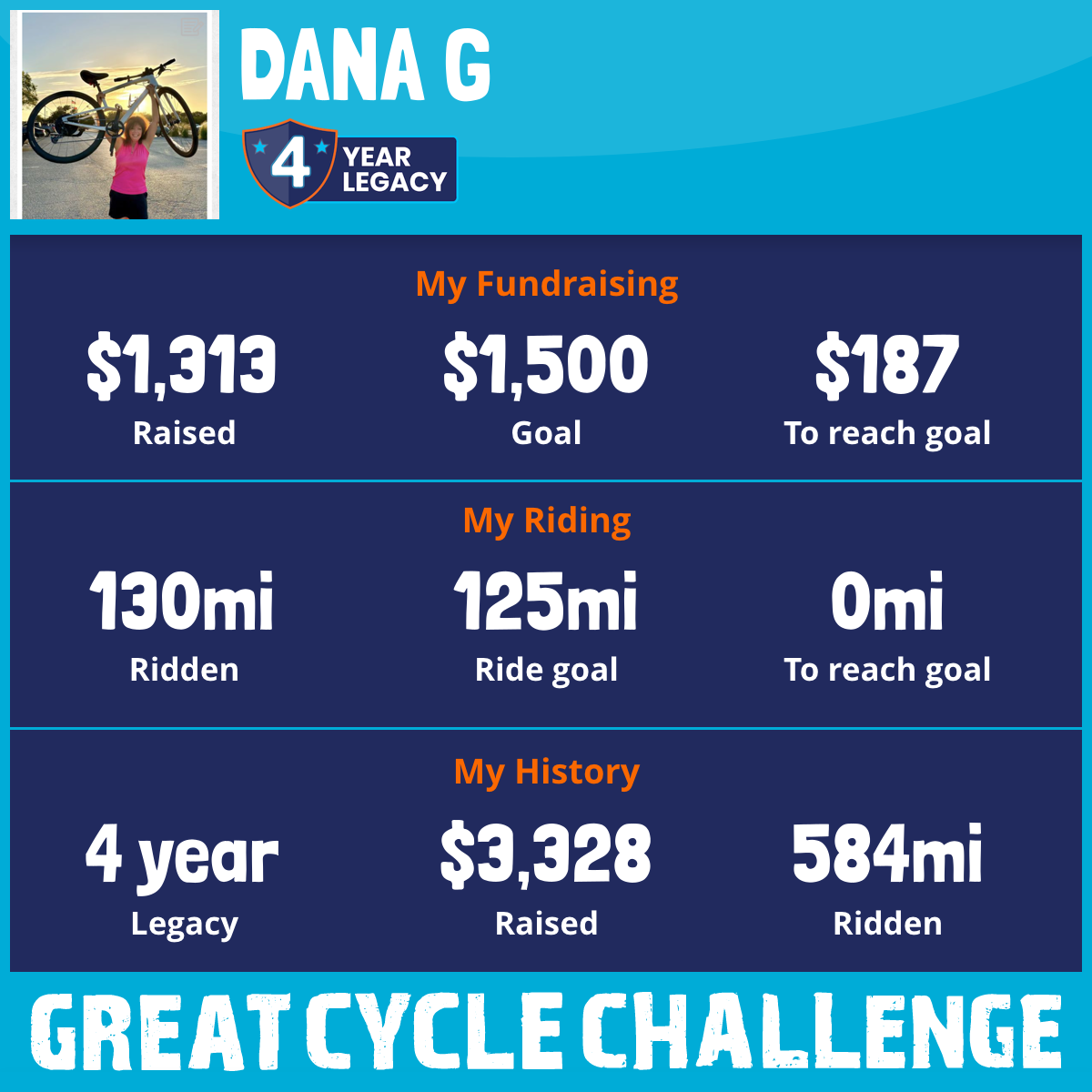 “Proud to have a team member, Bill G. as we took on the Great Cycle Challenge! 🚴♀️💪. Our goal 300 miles and $2,000.00 this year to support the kids!