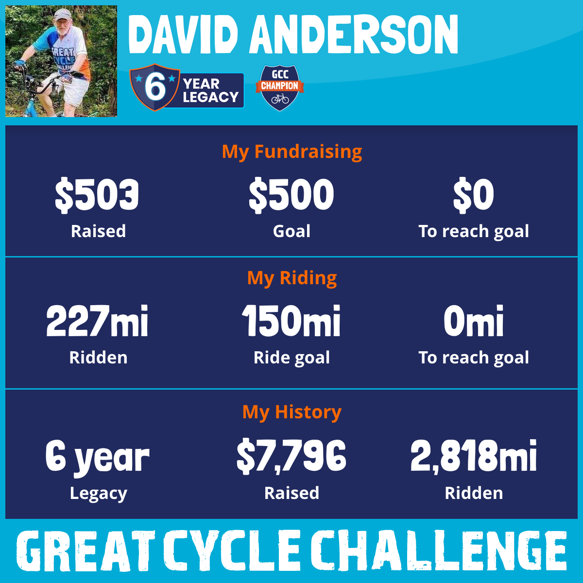 I am riding 150 mi in memory of Denver Anderson. Please sponsor me and support my challenge to fight kids' cancer and save little lives.