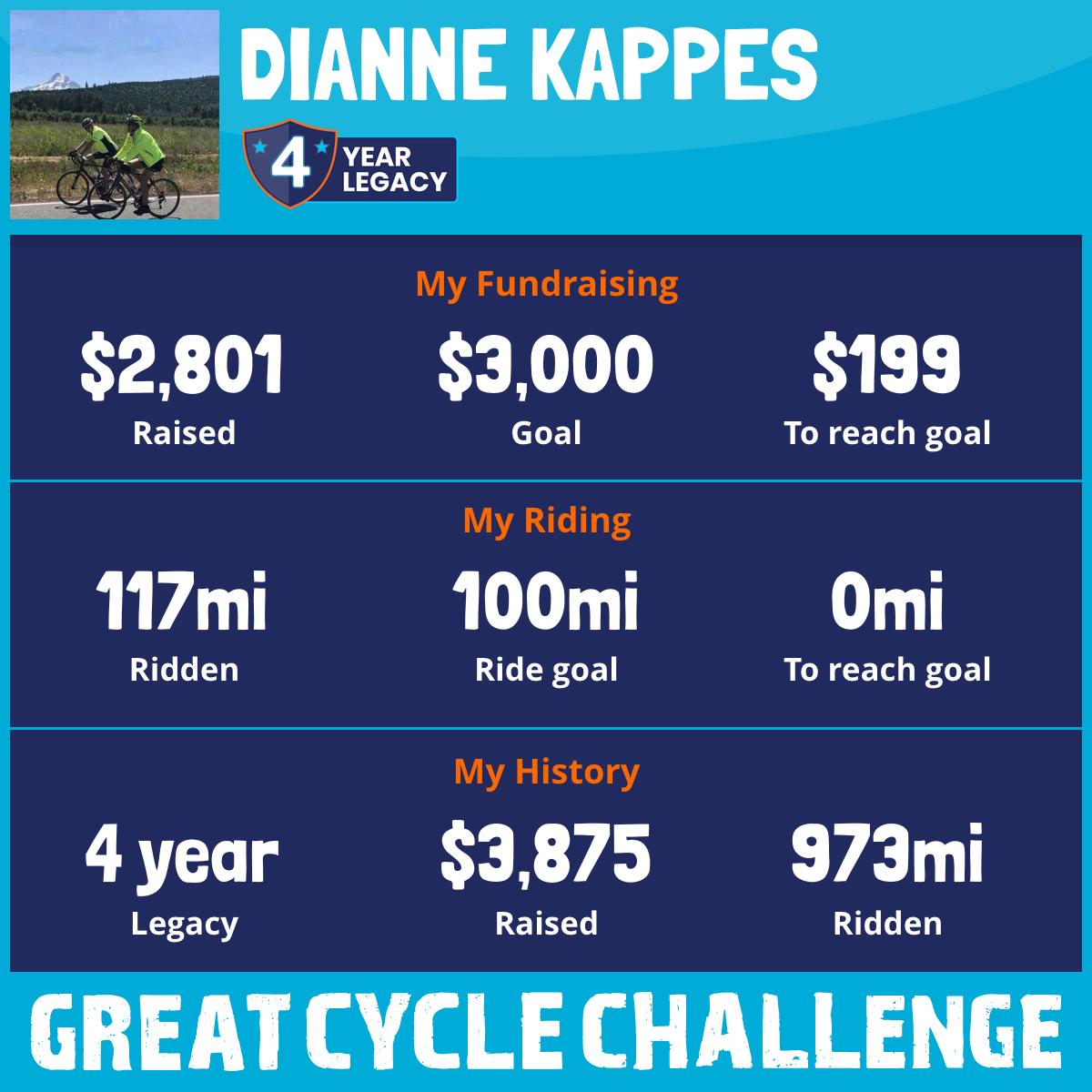 I am riding in memory of my husband Denny who left us way too young. Here we are cycling in sync with Mt. Hood in the background. This image of him being right along side me will guide me as I cycle and raise funds to fight pediatric cancer.