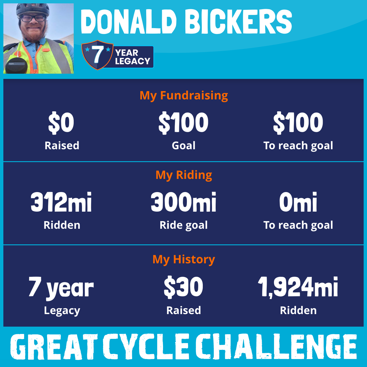 I am riding 300 mi for Dad. Please sponsor me and support my challenge to fight kids' cancer and save little lives.
