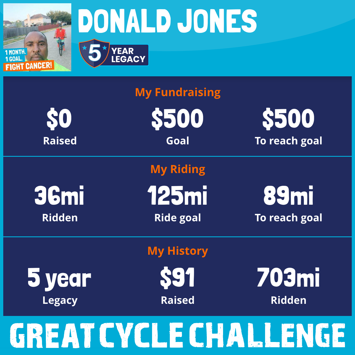 I am riding 125 mi for Sharon Jones(wife). Please sponsor me and support my challenge to fight kids' cancer and save little lives.