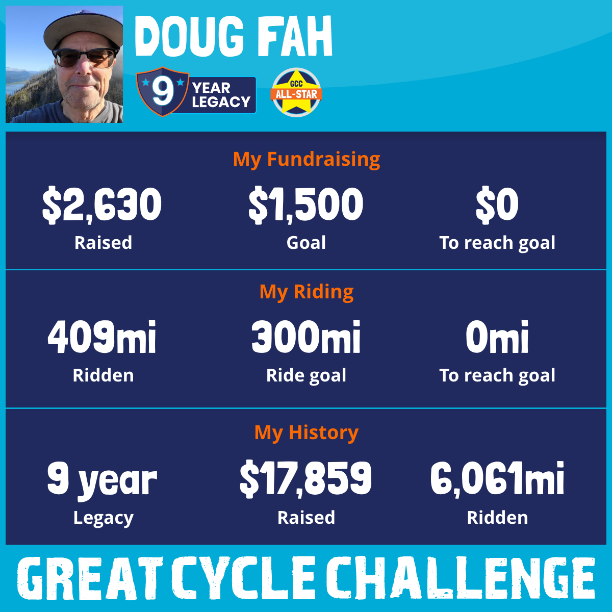 After a year hiatus, I am once again (year 9!) taking part in the Great Cycle Challenge to fight kids' cancer in September! I have pledged to ride 300 miles in the month of September and, through your generosity, hope to raise $1,500.