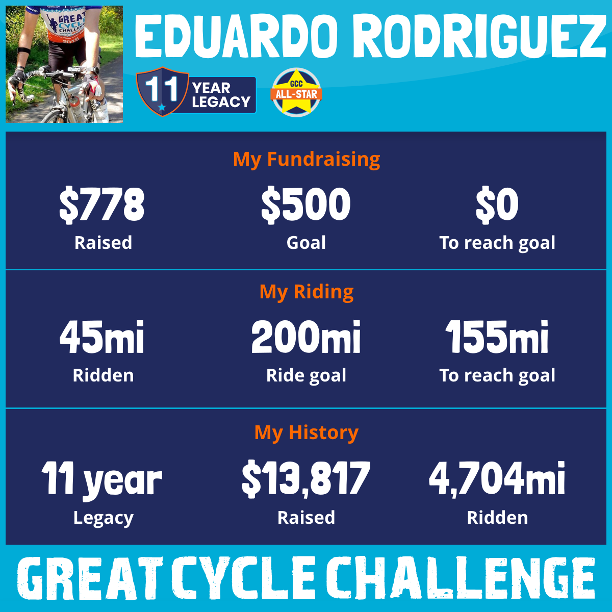 This year I am back on my bike and trying to ride as much as i can. The reason I take the challenge is because more American children lose their lives to cancer than any other disease - 38 kids die every week, I will set my miles goal to 250, but i will keep increasing if i can ride more and more.