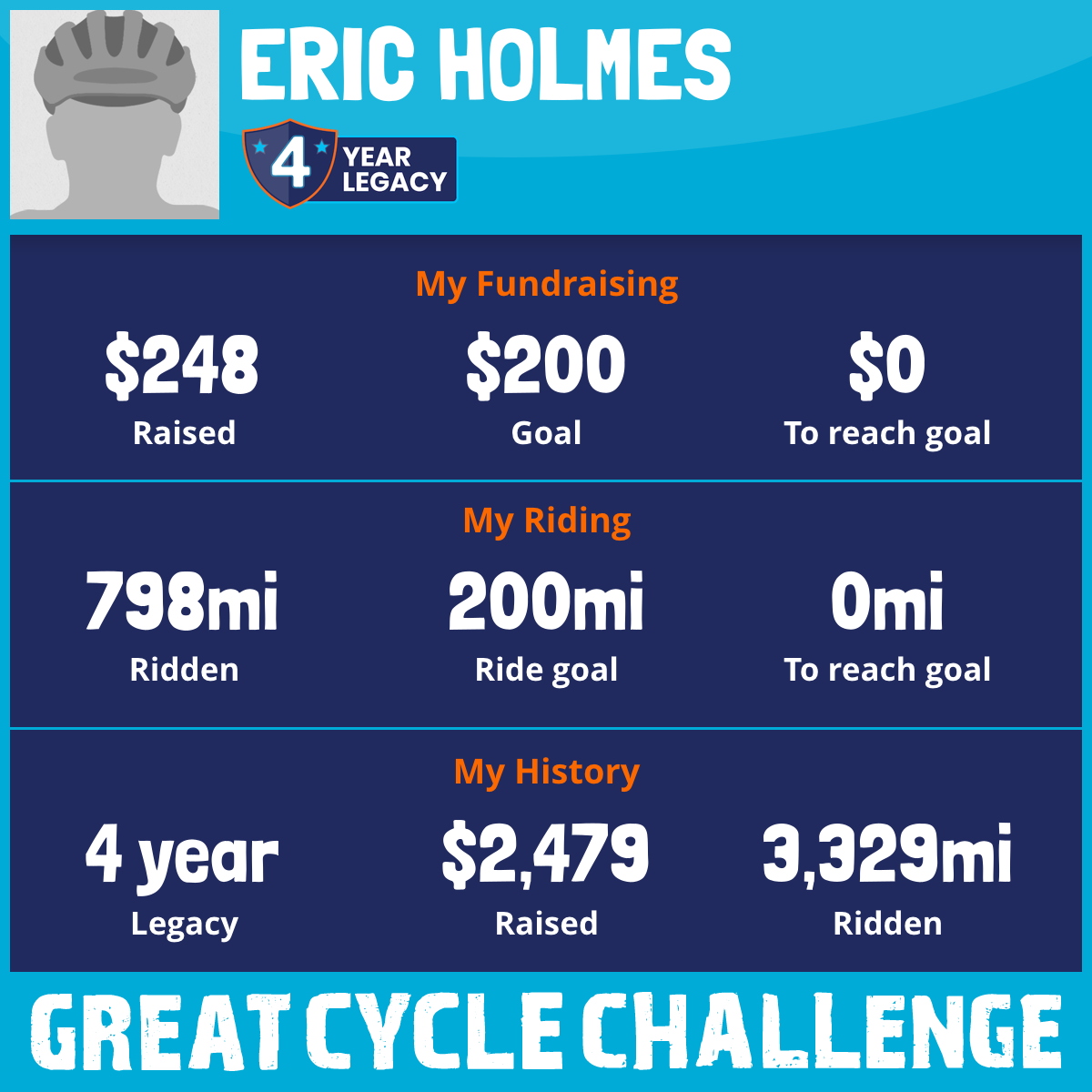 I am riding 200 mi in memory of my dad, David Holmes. Please sponsor me and support my challenge to fight kids' cancer and save little lives.