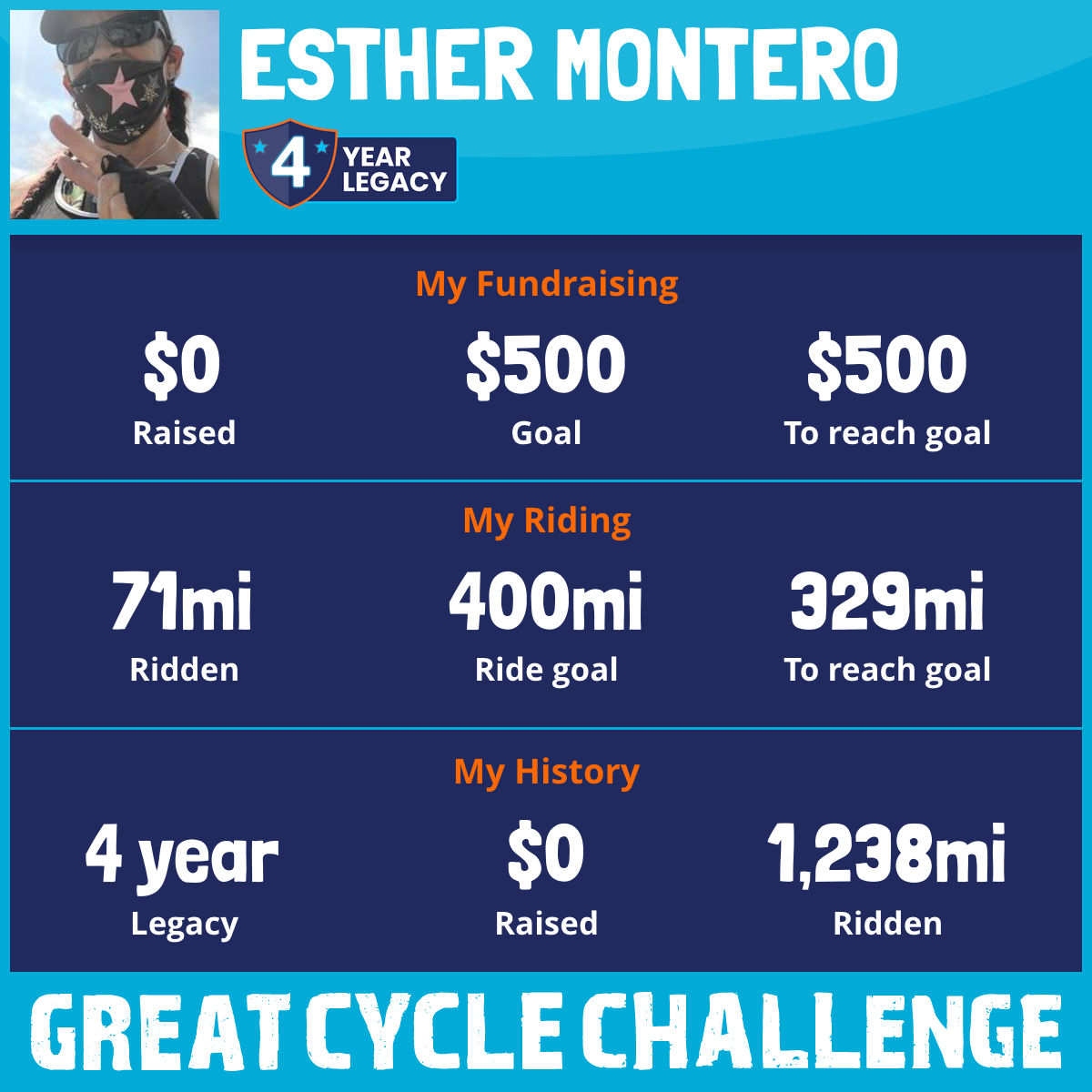 I am riding 400 mi in memory of Irene. Please sponsor me and support my challenge to fight kids' cancer and save little lives.