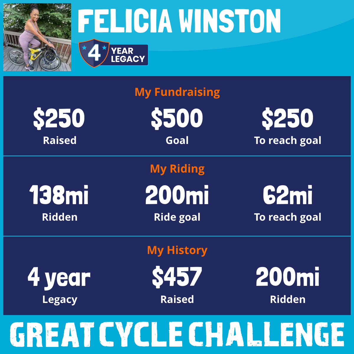 “Cancer is such a nasty disease and even more so when kids have to battle it. Thanks Felicia for your efforts to raise funds to fight this disease. May God bless you and all the kids affected by this disease. Ride safely! Annette”
