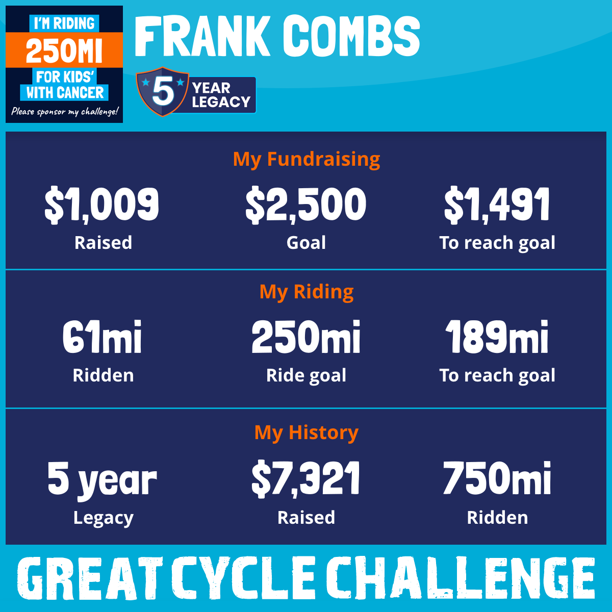 To All that will take a moment or two to Read this, Thank You!!!! My 5th year doing this wonderful Challenge to raise funds to help cure the rate of CANCER in CHILDREN. I did get a late start this year due to waiting for a release from my doctor after a surgery.