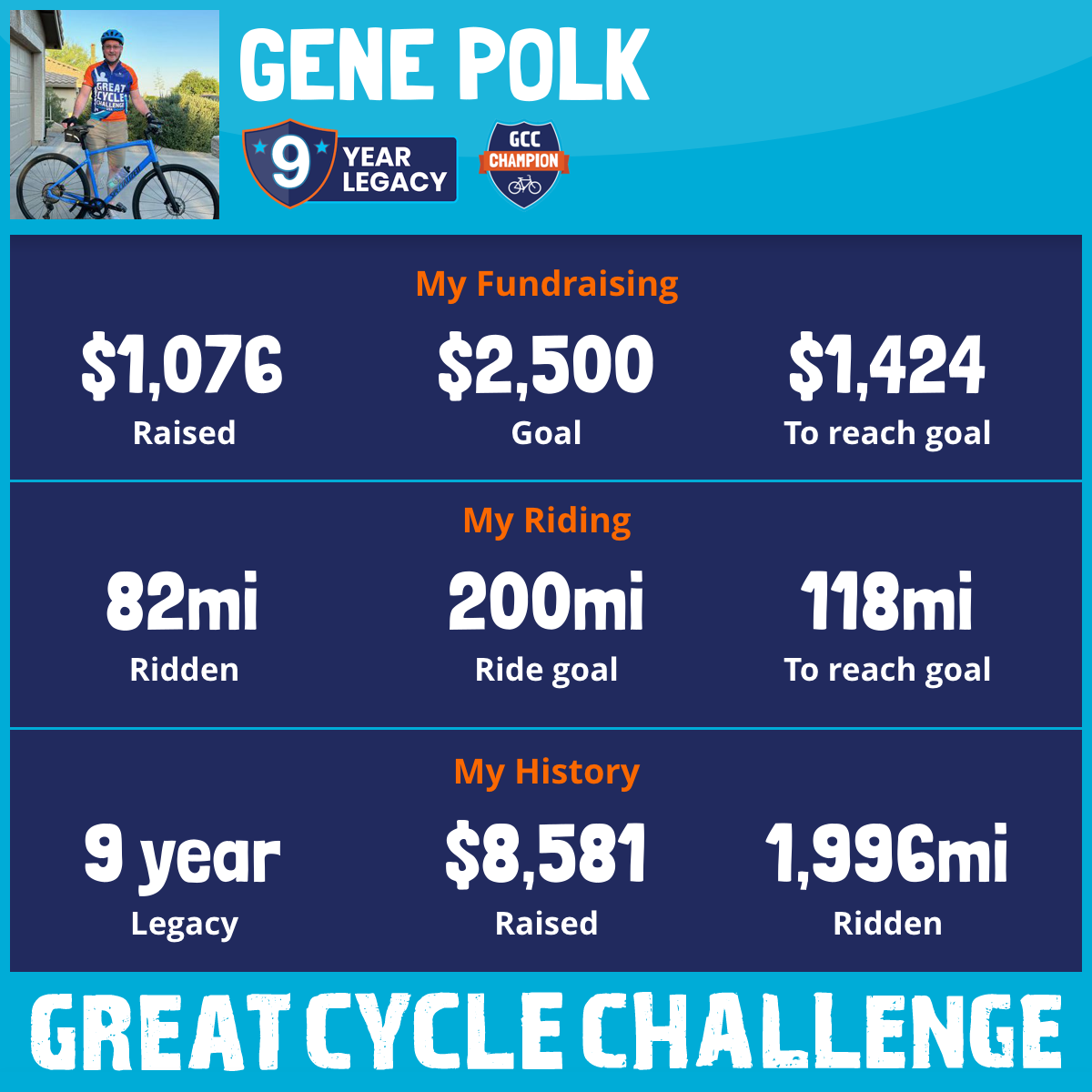 In September 2025, I will participate in the Great Cycle Challenge to support the fight against kids' cancer. This will be my eighth year riding for this cause, which is near and dear to my heart.
