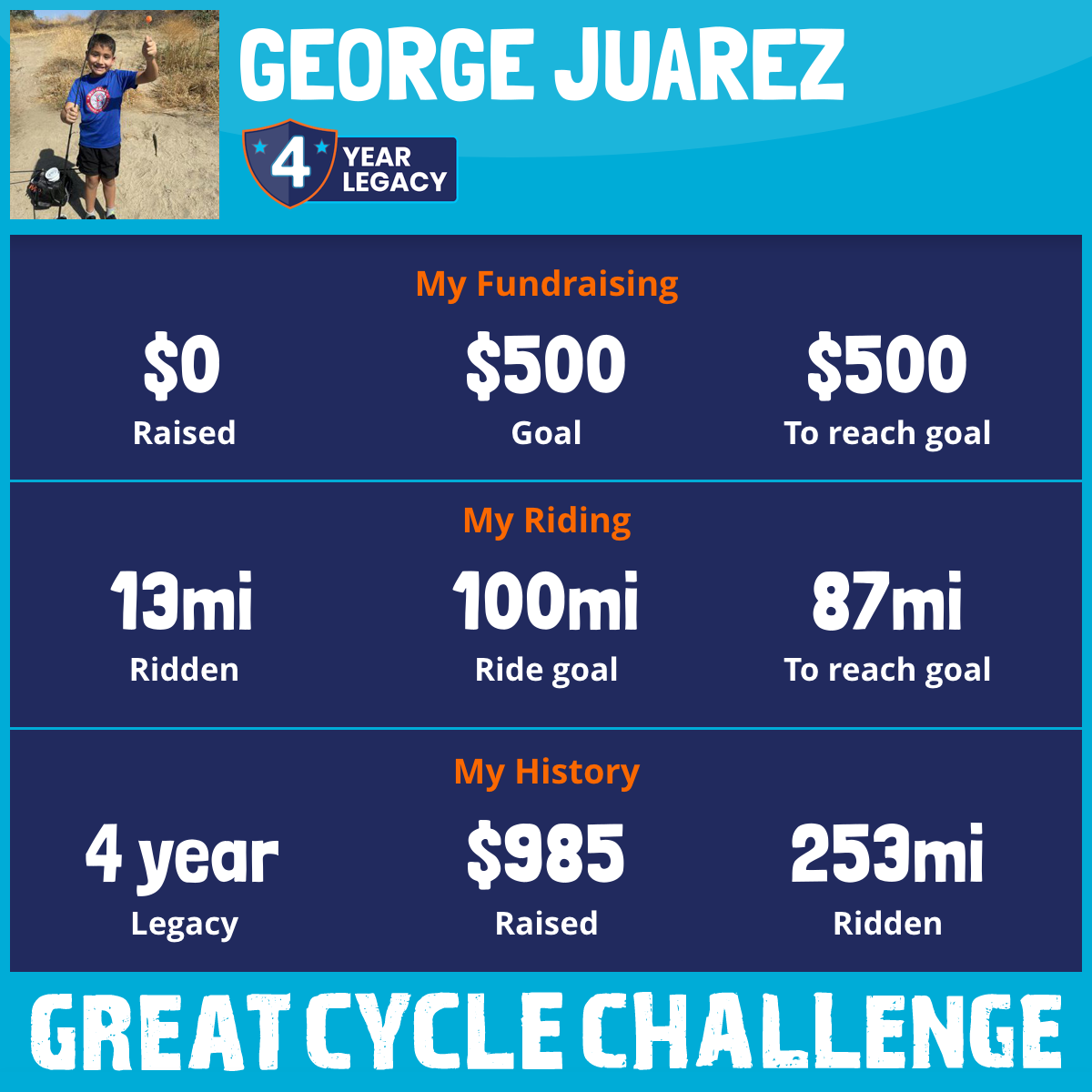 I am riding 100 mi for my son, Jonathan Juarez. Please sponsor me and support my challenge to fight kids' cancer and save little lives.