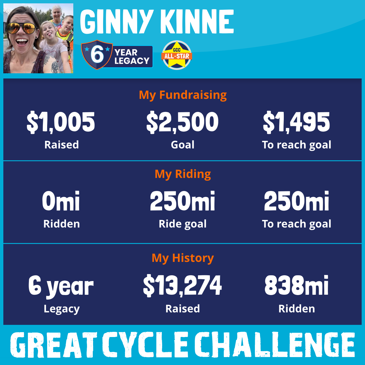 In September, I will participate in my 6th Great Cycle Challenge to fight kids' cancer! This year I pledge to raise $2,500 and ride 250+ miles. Hopefully, I will blow BOTH of these numbers out of the water! Over the last 5 years, we've helped raise more than $12,500 for kids' cancer research!!!