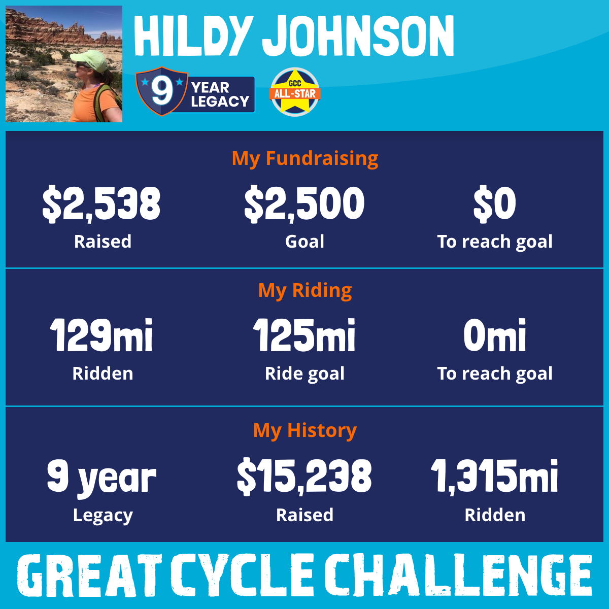 Every year that I have ridden for the Great Cycle Challenge I ride in honor of and in memory of many family and friends. Sadly, some may no longer be with us, some have conquered the disease and some are able to continue living with it due to advances made with research and medications. Please know any amount…large or small helps give these children a better chance of living life! Thank you!