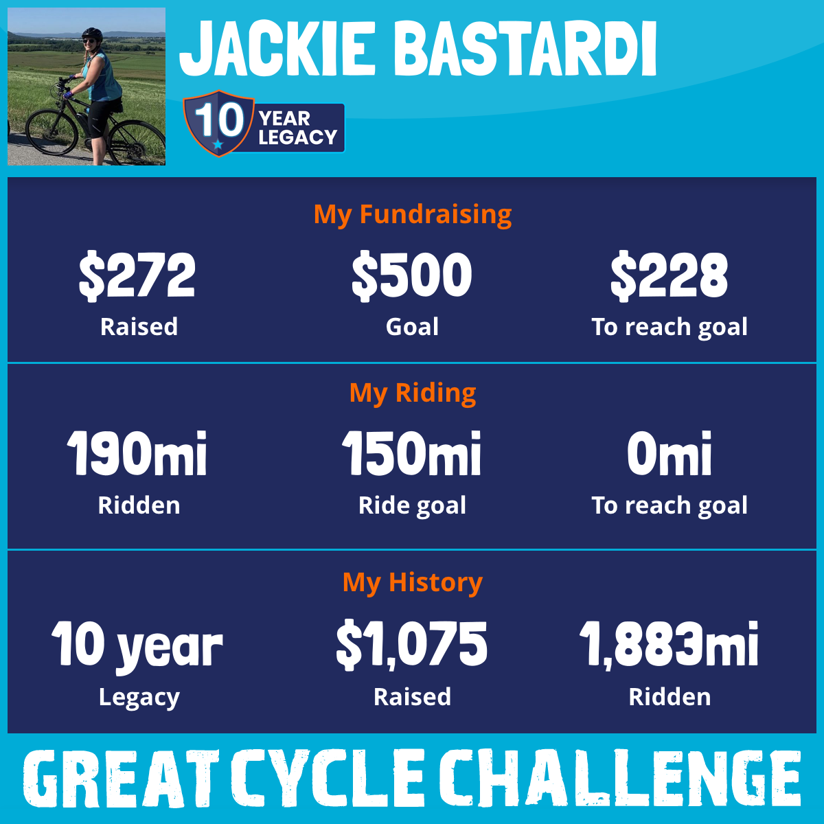 I ride in honor of my grandma, Kay Bastardi. She was one of the most generous and kind women I have ever known. She was one of the strongest people I've ever met, and fought leukemia and heart disease. I ride because she believed in helping others, especially children. I hope to carry on her mission to help as many people as I can through charity and volunteer work.