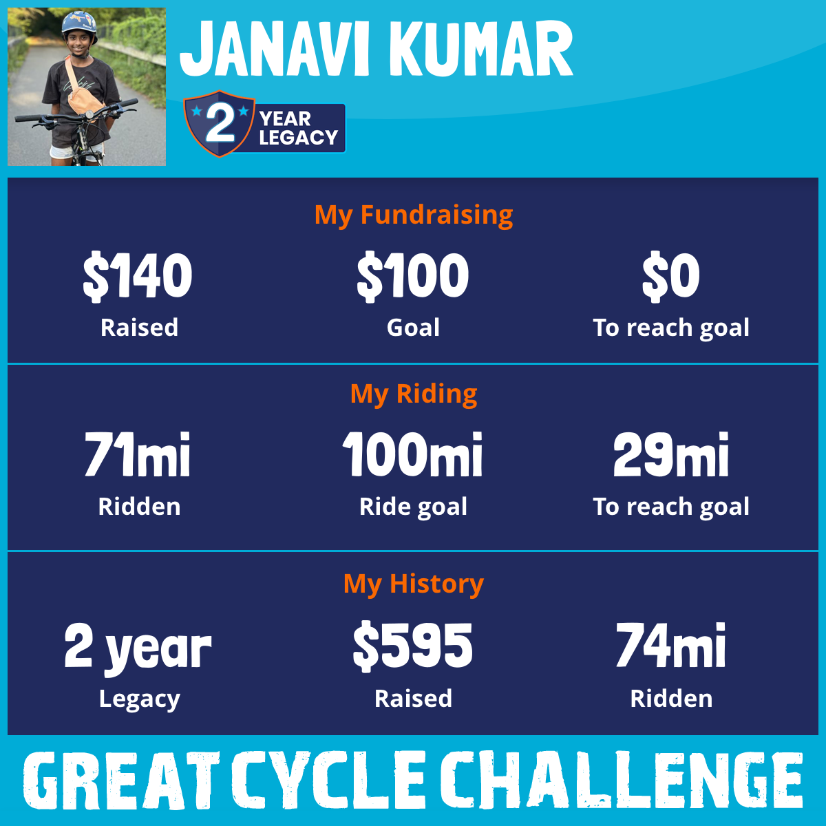 28 Jun 2025I started doing the Great Cycling Challenge last year. I had been biking since I was little. My dad and I found out about the GCC through a family friend. From that day on I biked so much, my whole summer was just spent preparing for the GCC in September. I was so excited because I biked so much for fun but now I finnally can help save lives. During the summer I biked about 275 miles.But September came by so fast it was a blur. I got sick and starting middle school was tough, the new homework and all my extra activities after school were tiring. I barely had time to bike. I remember trying to bike as often as I could but it wasn't enough. I had worked so hard on training for that very moment. So this year I'm prepared, ready for everything and anything that comes my way!