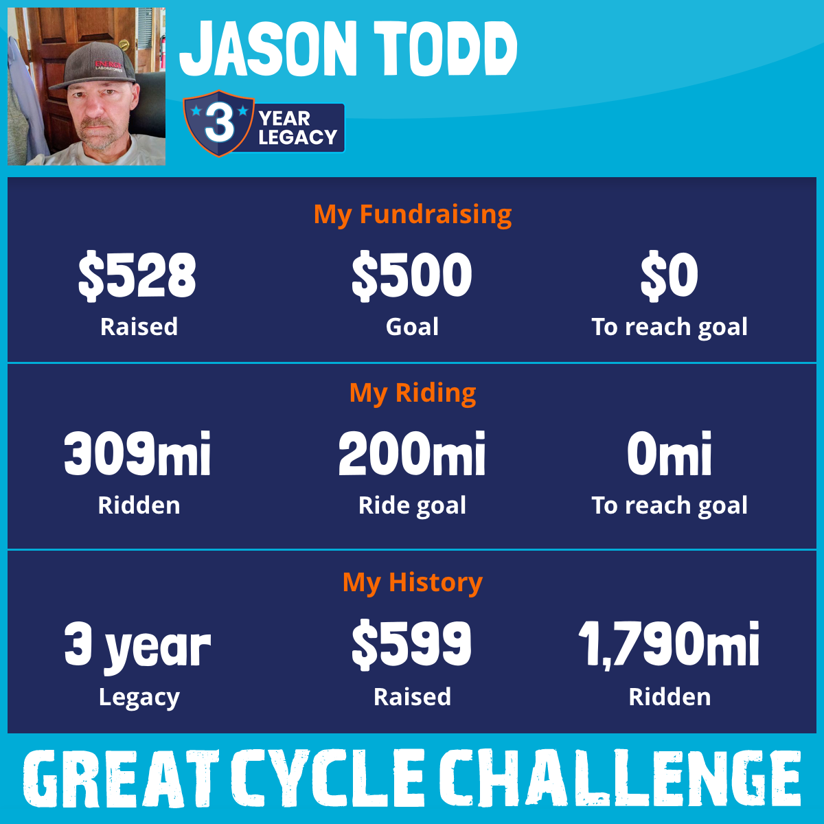 I am riding 200 mi in memory of Jonathan Jay Todd. Please sponsor me and support my challenge to fight kids' cancer and save little lives.