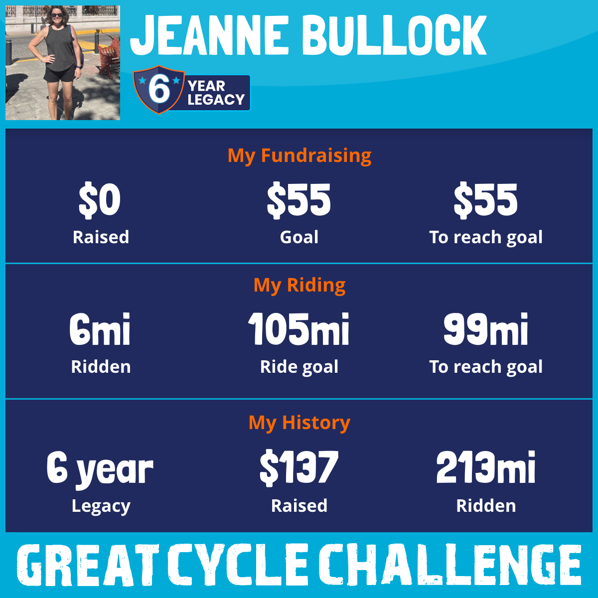 I've Ridden 6.0 mi My goal is 105 mi