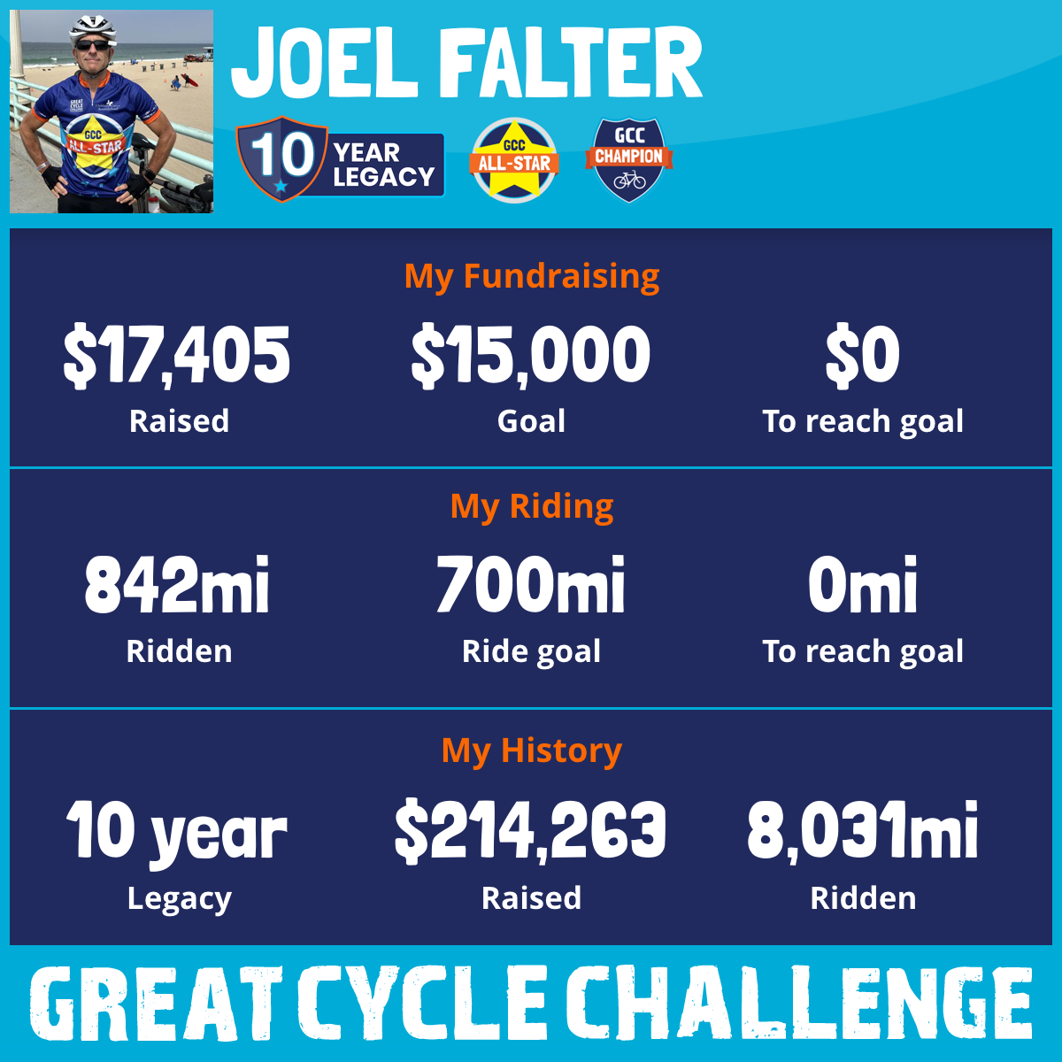 Please visit my page, https://greatcyclechallenge.com/Riders/JoelFalter and donate to my ride. Every dollar helps.