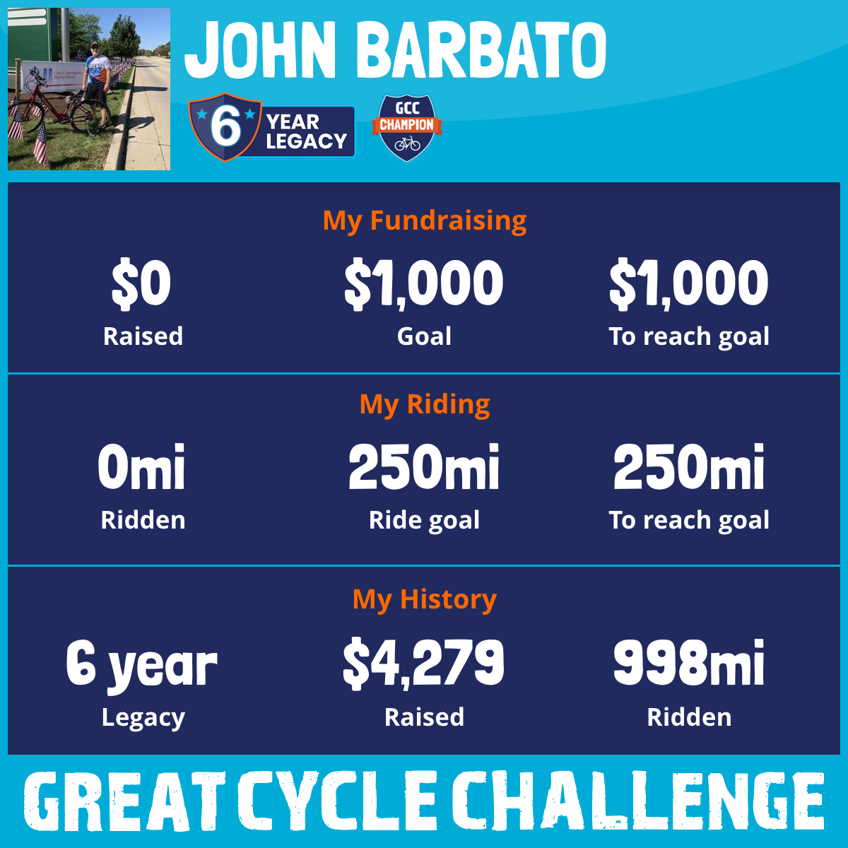 I am riding 250 mi for All the Kids. Please sponsor me and support my challenge to fight kids' cancer and save little lives.
