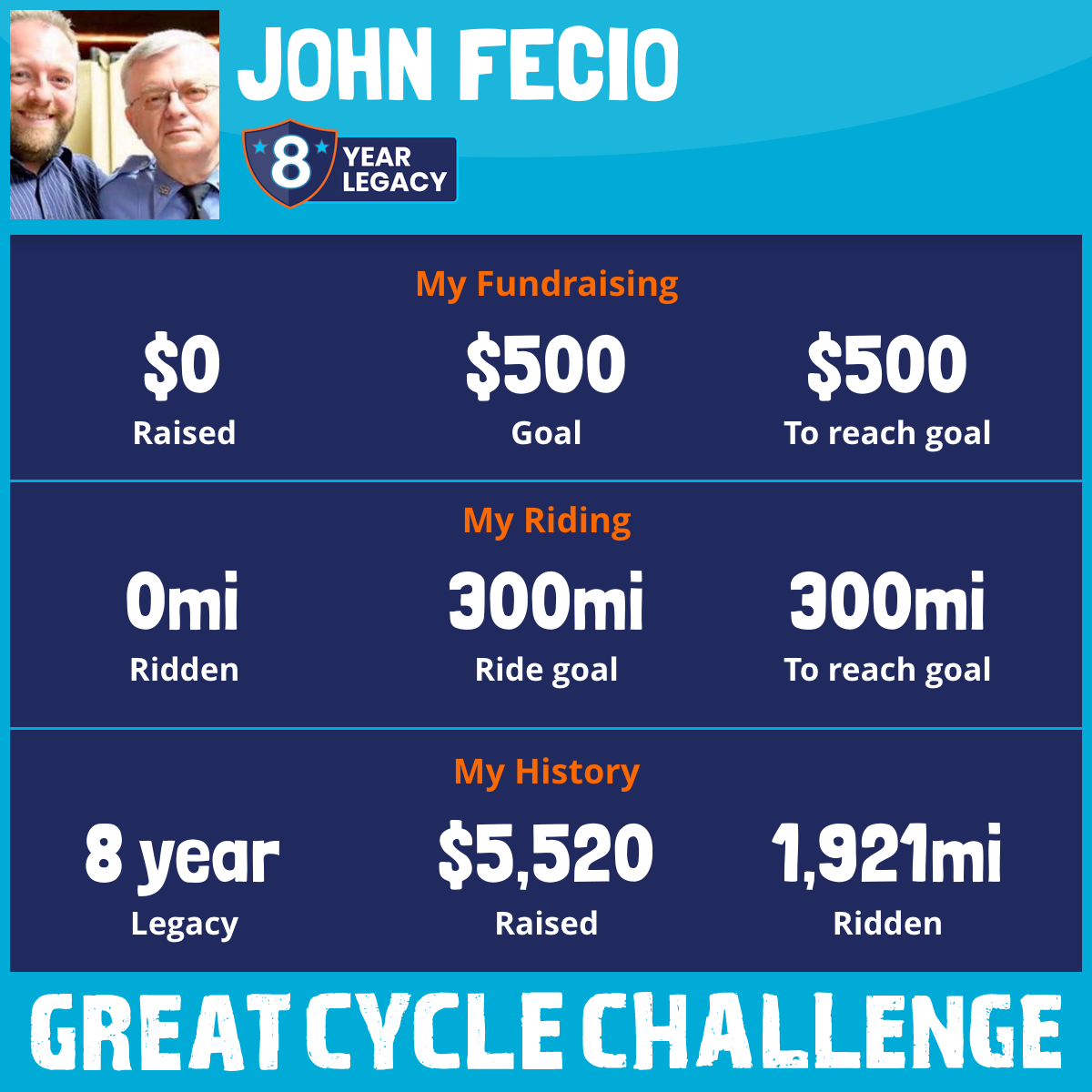 I am riding 300 mi for my dad, Jack Fecio. Please sponsor me and support my challenge to fight kids' cancer and save little lives.