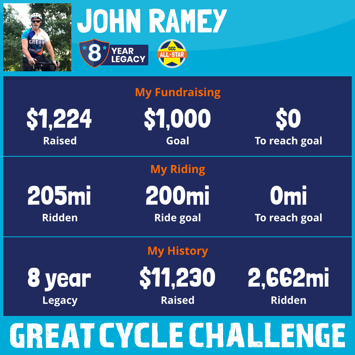 This is my 7th year riding to fight Kid's Cancer. The past 6 have been in memory of my friend Stephanie; who passed away from Pancreatic Cancer. This year I will be riding in memory of her but also for my nephew who was recently diagnosed with a Non-Germinoma germ cell tumor. It's a rare pediatric brain cancer. He has finished radiation and chemotherapy treatment. He will wait for the results of his latest scan and see it further treatment is needed. I want to thank everyone for their support!