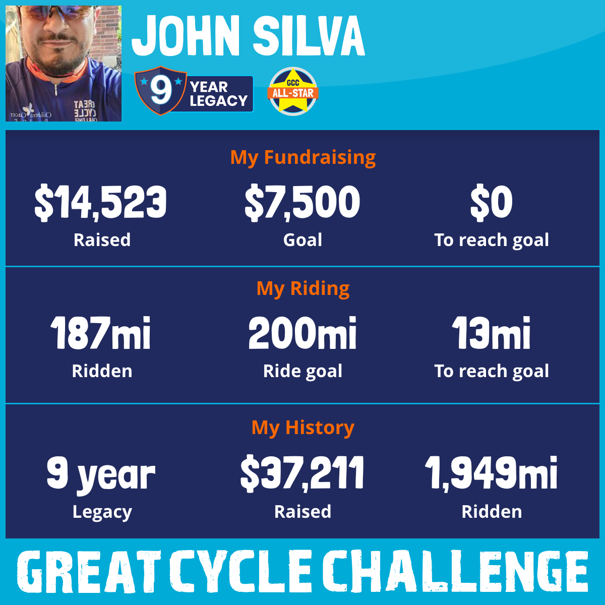 9 years ago I survived twice against Stage 4 Classic Hodgkin's Lymphoma. With all the hurdles and obstacles my diagnosis had brought I cannot begin to imagine what some children and their families go through to survive. I will continue to use my time and abilities to help those less fortunate. I know that with your help WE CAN BEAT CANCER! Please help me complete my pledge is to cycle 200 miles and fundraise $7500! Please share my story and pledge with your family, friends, coworkers, and businesses to Donate!