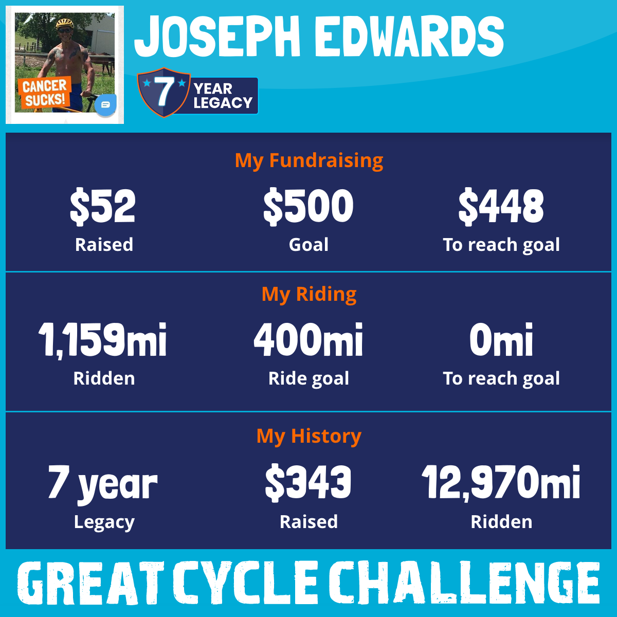 I am riding 400 mi in memory of Charles & Charlotte Edwards. Please sponsor me and support my challenge to fight kids' cancer and save little lives.