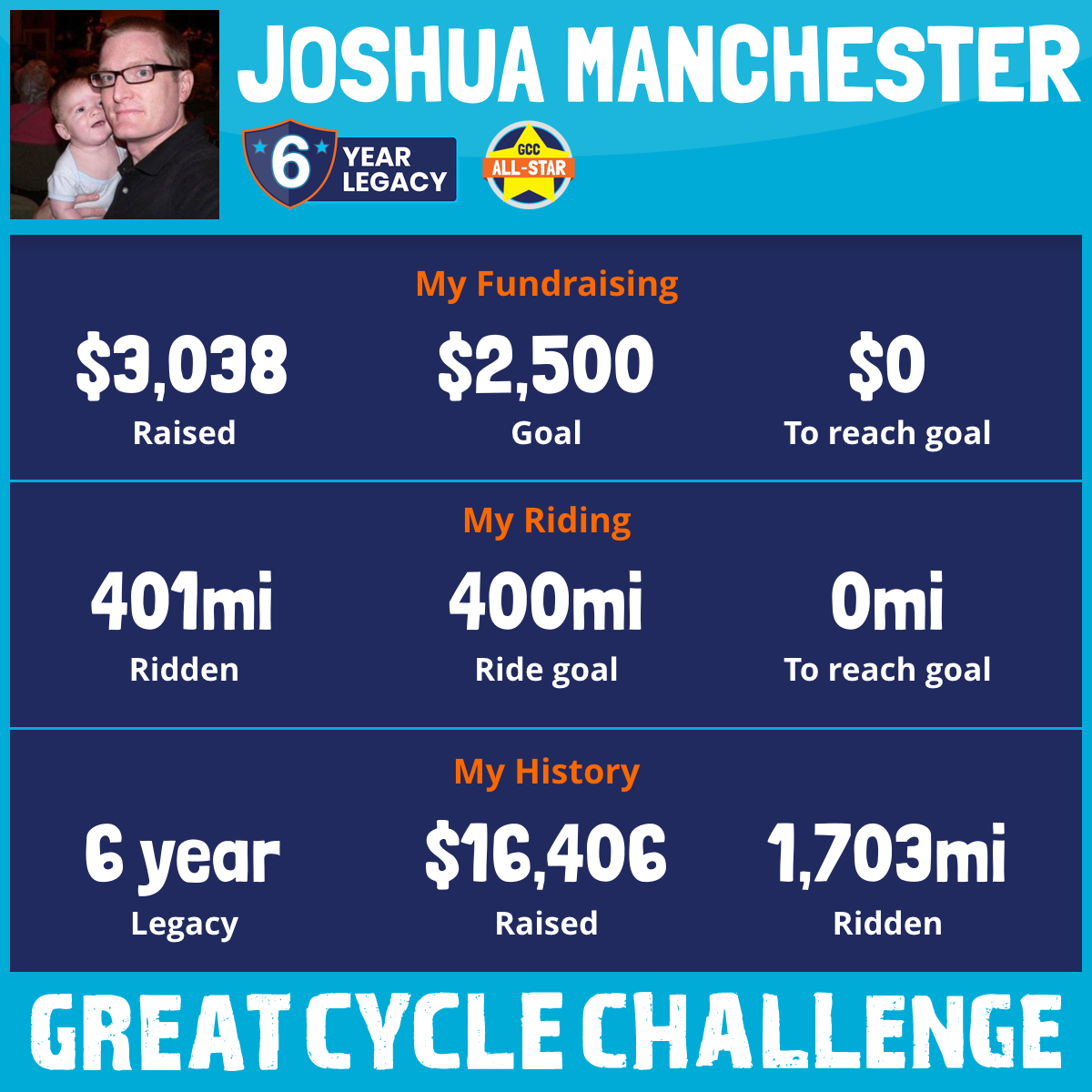 I am riding 400 mi in memory of Omar Manchester. Please sponsor me and support my challenge to fight kids' cancer and save little lives.
