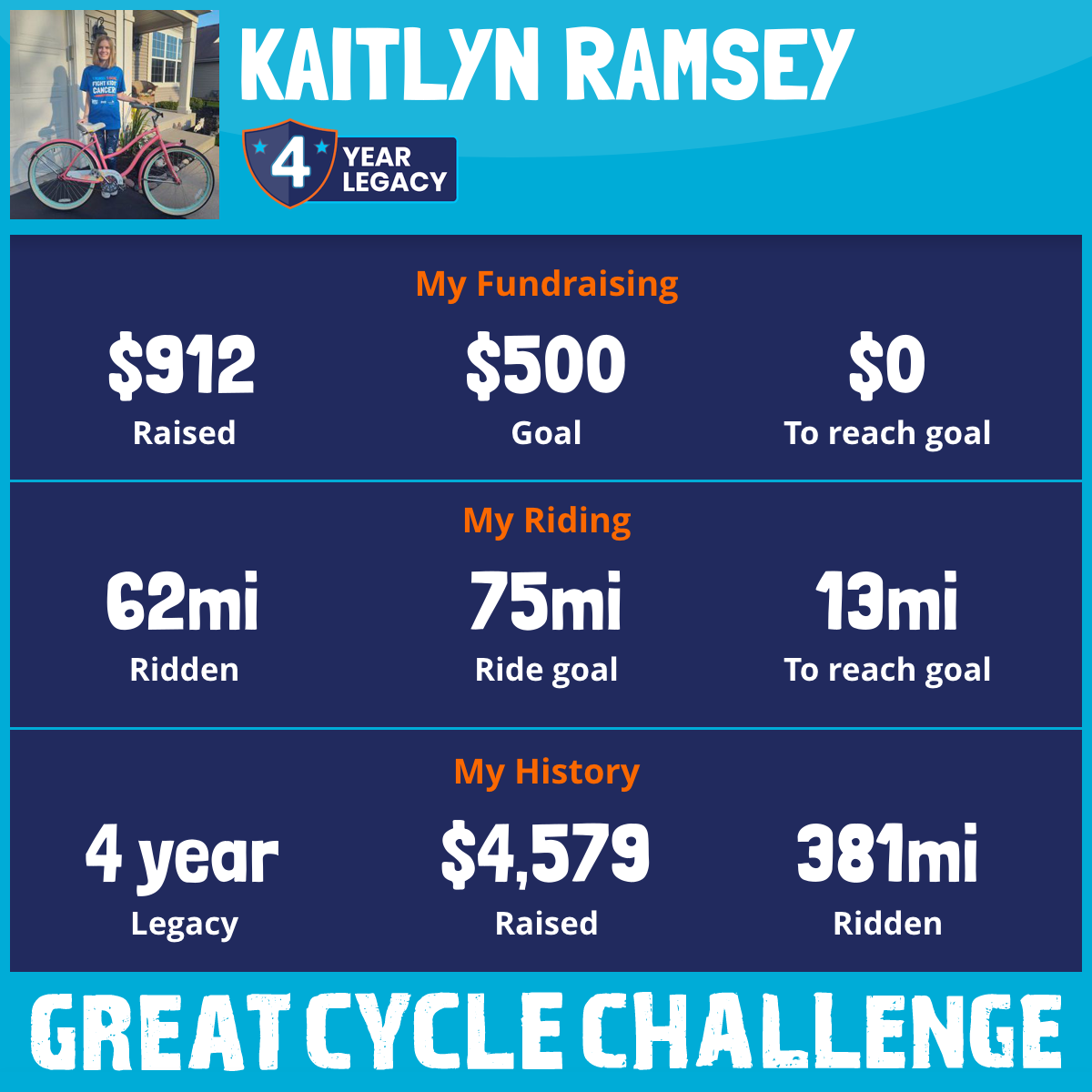 Hello, my name is Kaitlyn Ramsey and I am 16 years old. This is my 4th year participating in The Great Cycle Challenge. Every year I ride in honor of Vivian Brann. All money raised goes to help find a cure to childhood cancer. It has not been easy but every year I have met those goals thanks to people like you.