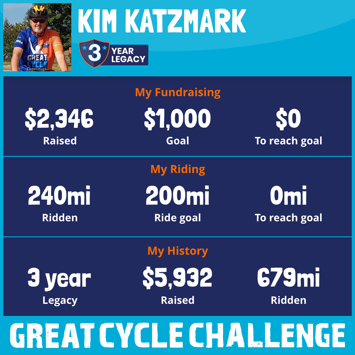 Many of you knew my daughter Katie. She was not a child when cancer took her but if we can figure out how and why cancer attacks children or adults we can save many lives. Katie loved to ride her bike. She and I shared many rides together and even a few sprint triathlons. She always said she didn't care where she finished as long as she beat her dad. The last one we did she accomplished this. Due to Katie's love for biking I thought this challenge would be a fitting way to honor her and that is why thiis September, I am taking part in the Great Cycle Challenge to fight kids' cancer!