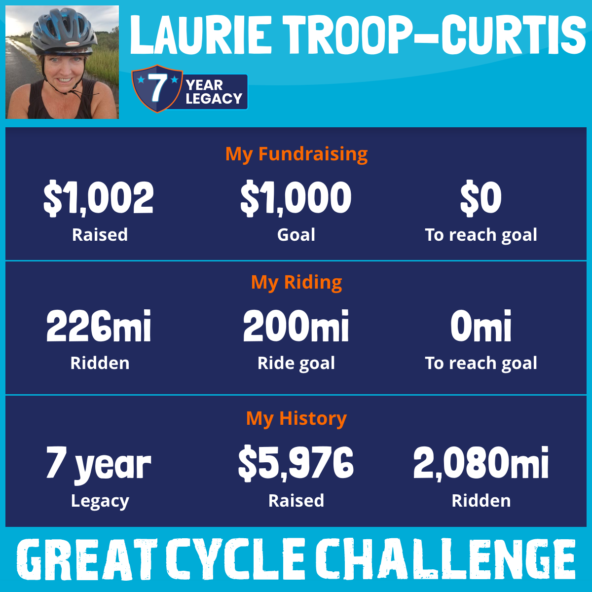 I'm riding to benefit the fight to end childhood cancer and in memory of my dad who died in 1995 after an 18 year battle with leukemia. As bad as it was seeing my dad fight leukemia and deal with infections and the constant lack of immunity, I can't imagine how hard it is for children with cancer, and their families. I am riding my bike 300 miles in September because I want kids to live happy healthy lives. My goal this year is to raise $750. Please help me reach this goal to help fund lifesaving treatments, fund cancer research, and to find a cure for childhood cancer. Thank you so much! Laurie