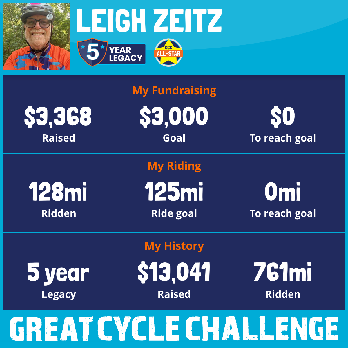 In 2020, 2021, 2023, and 2024, I pledged to ride over 600 miles in September and raise $1500 each year. I met my riding goals, and you, my supporters, helped me raise over $9,600.