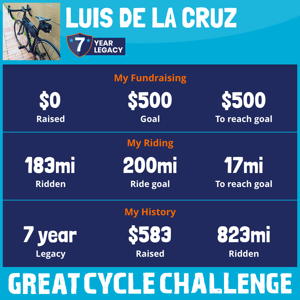 I am riding 200 mi for my loved one, Armando Amador, Tita Hedi, Jesus Garcia, Sierra. Please sponsor me and support my challenge to fight kids' cancer and save little lives.