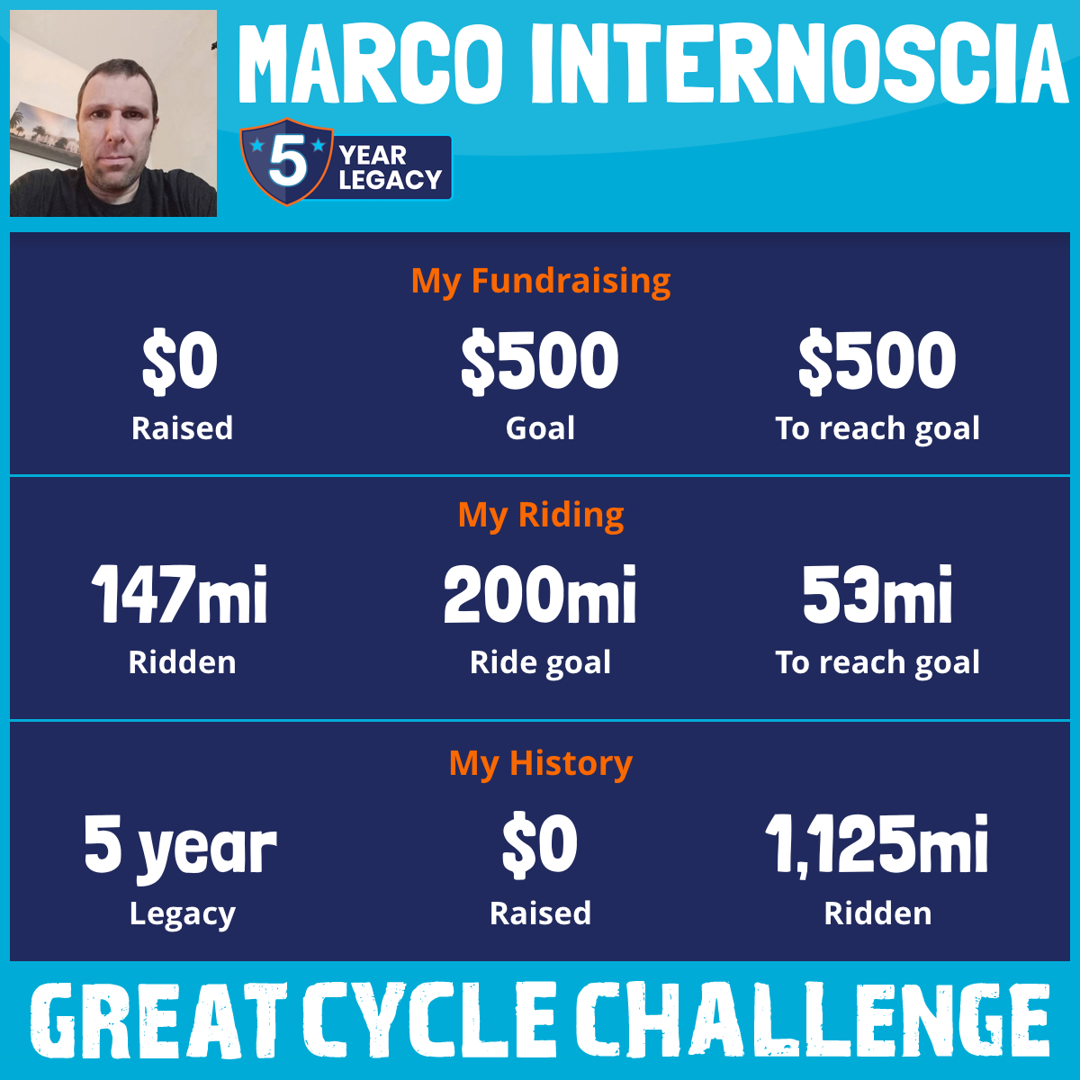 I am riding 200 mi in memory of Salvatore. Please sponsor me and support my challenge to fight kids' cancer and save little lives.