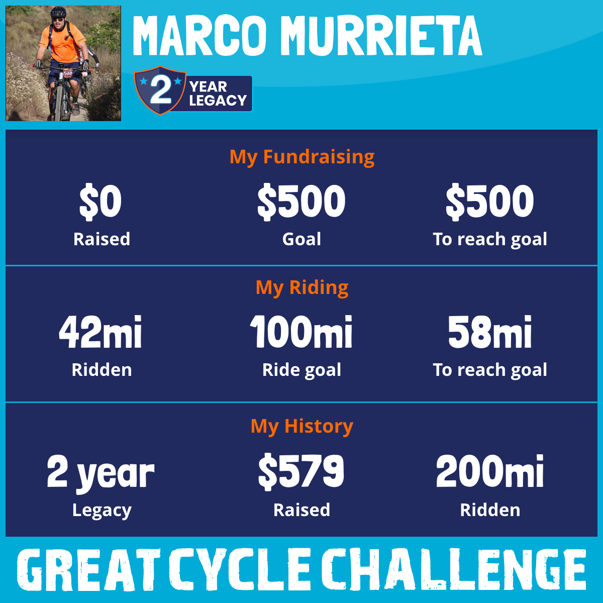 I am riding 100 mi in memory of Marco Antonio Murrieta. Please sponsor me and support my challenge to fight kids' cancer and save little lives.