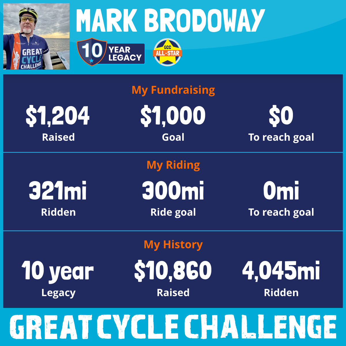 This September will be my 10th year taking part in the Great Cycle Challenge to fight kids' cancer! I am proud of my family and friends who have generously helped me reach my goal each year, let's do it again